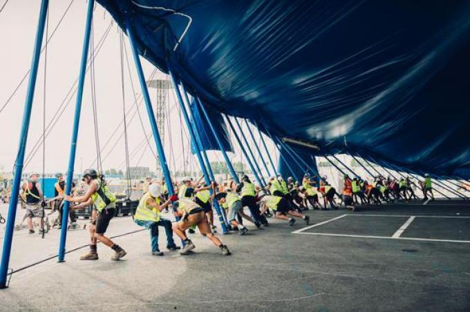 Zestig crewleden werkten samen om meer dan honderd steunpalen op hun plaats te duwen en zo het imposante canvas van de circustent op te richten. De komende zes dagen staan in het teken van technische opbouw en acrobatische repetities, zodat cast en crew helemaal klaar zijn voor de eerste voorstelling.