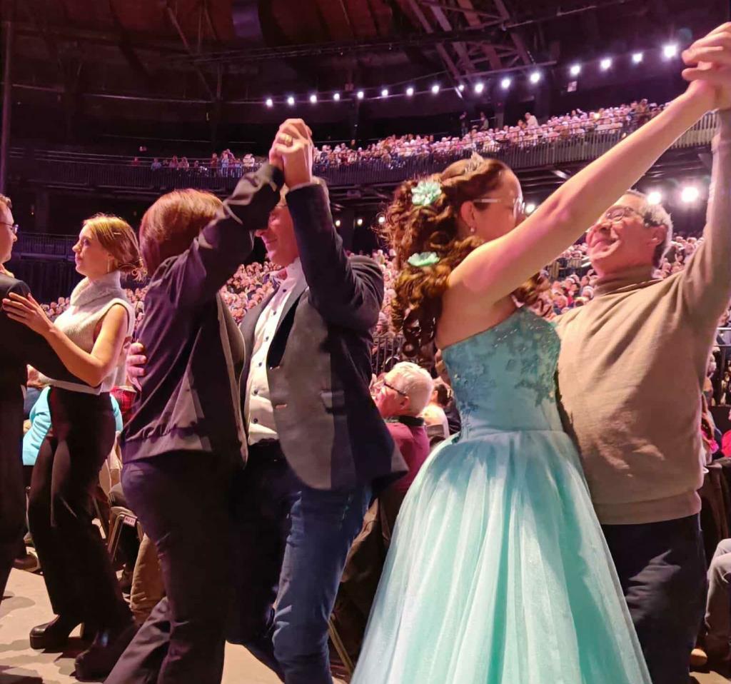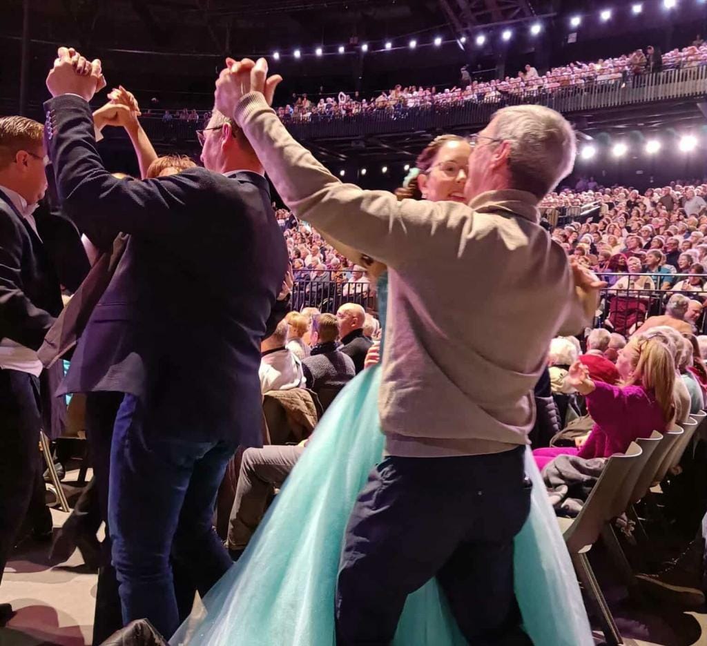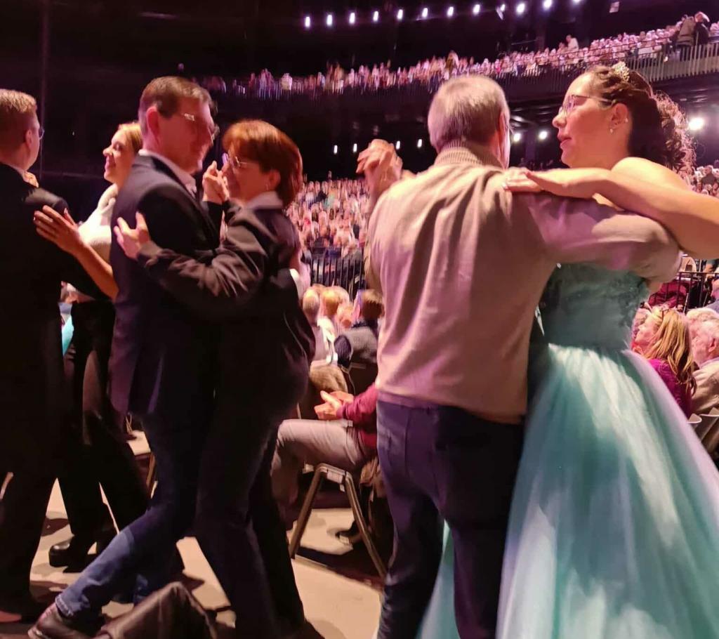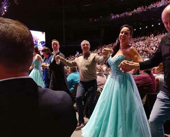 Voor Patrick (72) en echtgenote Maria was het een heel geslaagde avond. Beiden zaten op de buitenkant van de middengang. Plots kwamen een 40-tal dansparen al dansend in die gang staan. Patrick, maar ook andere aanwezigen, werden eruit gepikt om een Weense wals te dansen. “Die mevrouw voelde blijkbaar direct dat ik vroeger ook nog had gedanst door de houding die ik aannam en door de leiding die ik overnam”’, vertelt Patrick. “Ze zei: ‘Amaai, die houding en dat gevoel!’ Dat gaf mij direct een klik om het goed te doen. Ik vertelde dat ik, samen met mijn vrouw, zo’n twaalf jaar dansles had gevolgd, waaronder een vijftal jaar in de Dansschool Beyaert in Ingelmunster. We dansten de Standaard Ballroom, Engelse wals, tango, Quickstep, Weense walz en Slowfox. Later gingen we ook dansen bij de professionele dansleerkrachten Cosyns in Hoogstraten. We behaalden daar bijna altijd finaleplaatsen, met als uitschieter de tweede plaats op het Belgisch kampioenschap in zaal La Madeleine in Brussel. Wegens gezondheidsredenen moesten we later de handdoek in de ring gooien. We blikken echter nog altijd graag terug op onze méér dan geslaagde danscarrière. En gisterenavond was dan weer een hoogtepunt door onverwacht te mogen meedansen op de muziek van André Rieu en zijn orkest in een volle AFAS Dome”, besluit Patrick. (PADI)