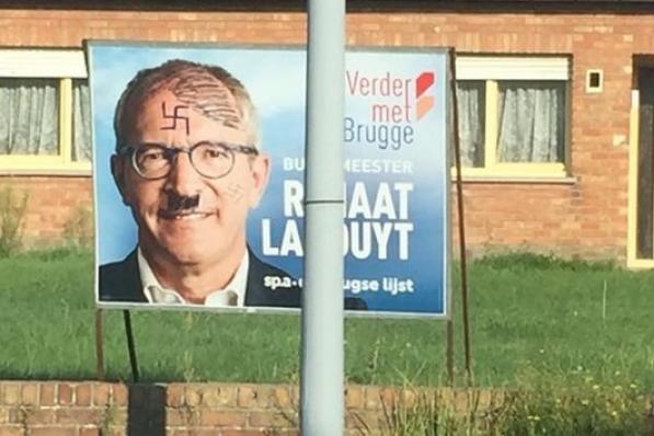 Brugge / Politiek Brugge / Politiek Vandalen tekenen Hitlersnor op verkiezingsbord Renaat Landuyt in Brugge 26 november 2020