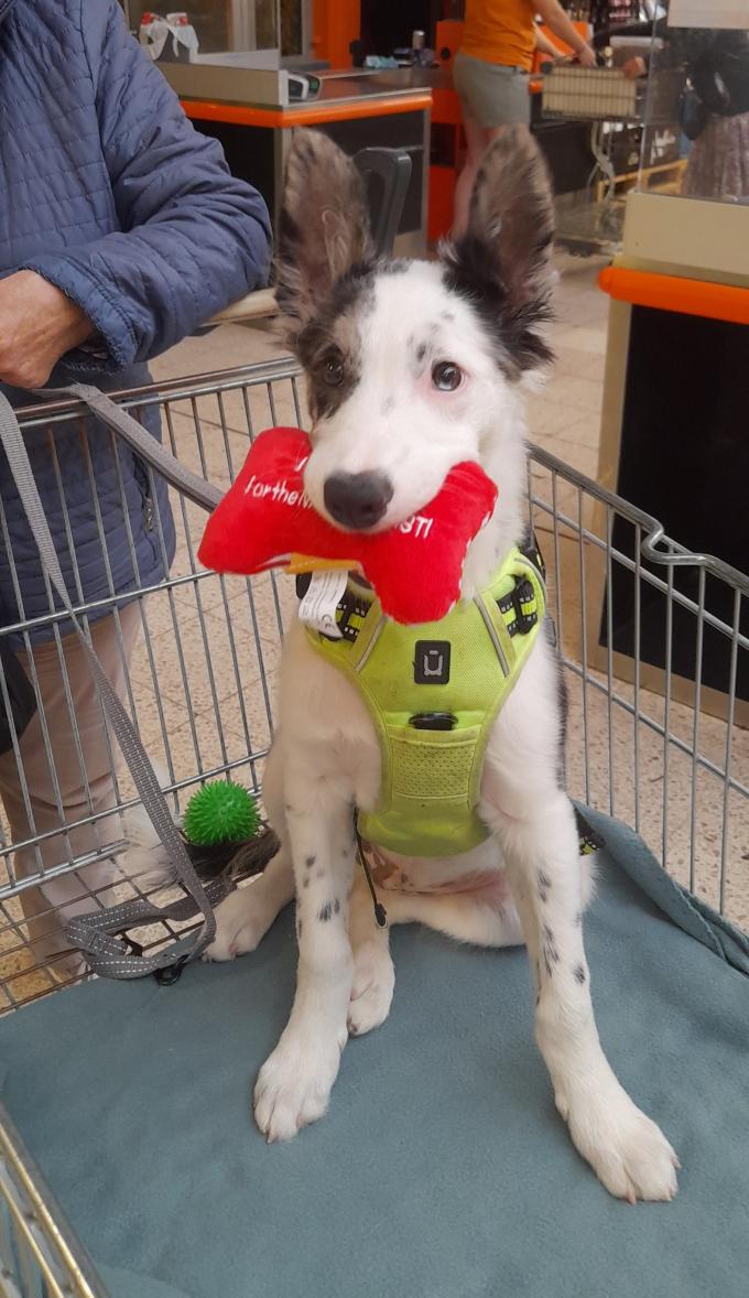 Blue is een Blue merle border collie reu van 4 maand. Het is de meest intelligente hond die ik ooit zag. Zijn eerste ochtend bij ons leerde hij al zitten. Het doel met Blue is om hem op te leren tot therapiehond voor woonzorgcentra en daarnaast wil ik met hem heel graag agility gaan doen.