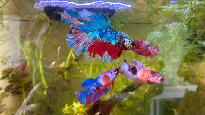 Visje (Kempvis – Betta) van ondertussen 6 maanden oud, met zijn harem van ondertussen 4 vrouwtjes!