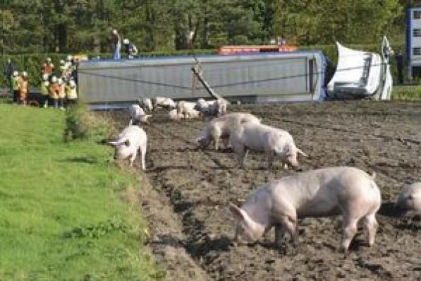 Beernem / Ongevallen Beernem / Ongevallen Vrachtwagen kantelt met varkens op weg tussen Beernem en Wingene 26 november 2020