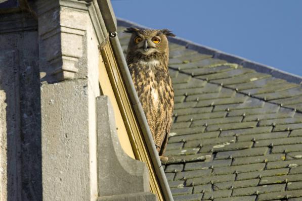 Diksmuide / Dieren Diksmuide / Dieren Vogelspotters speuren naar bijzondere oehoe die even paradeerde op kasteel, maar zich nu lijkt te verstoppen 24 november 2025