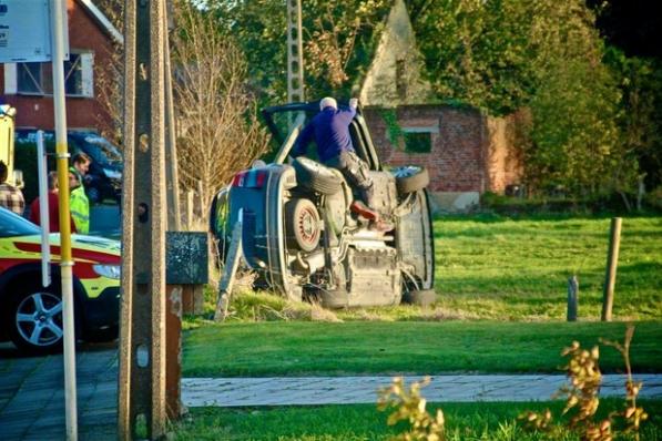 Eernegem / Ongevallen Eernegem / Ongevallen Wagen belandt op zijkant in weide in Eernegem 26 november 2020