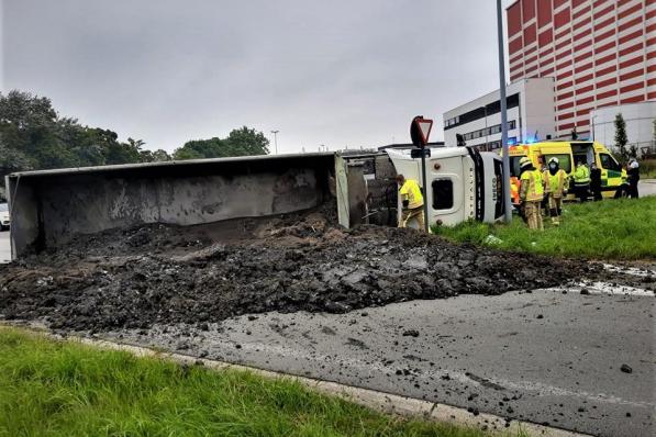 Roeselare / Verkeersongeval Roeselare / Verkeersongeval Mest verspert rotonde nadat vrachtwagen kantelt 27 juli 2021