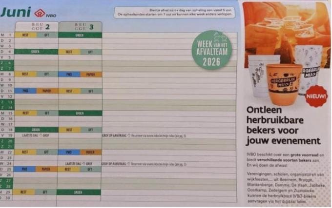 Op de kalender staan wekelijkse ophalingen van restafval, terwijl IVBO vanaf juni 2026 die restfractie in Brugge slechts om de twee weken zal ophalen. Dat is eind vorig jaar beslist in het nieuw afvalplan, maar staat niet vermeld in de kalender.