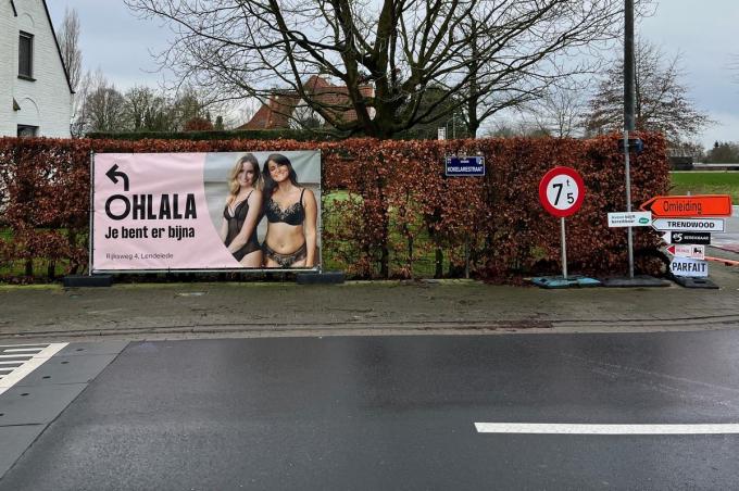 Lingeriezaak Ohlala is langs de Rijksweg in Lendelede gelegen, net voorbij de grens met Izegem. Om klanten die uit de richting Roeselare komen voorbij de wegenwerken op de N36 te loodsen, hangt er een banner met twee bevallige dames op de hoek van de Kokelarestraat en de Leenstraat op de Bosmolens. Maar vorig weekend had iemand geholpen om die dames het hazenpad te laten kiezen. “