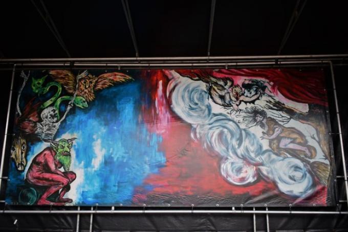 Vrijdagnacht pleegden onbekenden een daad van vandalisme op het canvasdoek dat achter op het podium hangt.