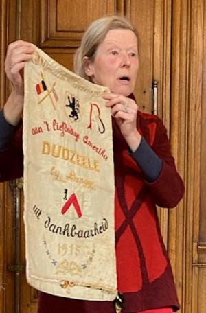 “Voor de boven- en onderranden zijn draden uit de stof getrokken en is een lint in de Belgische kleuren rood, geel, zwart, onze Belgische kleuren, door de stof geregen. Deze versierde meelzak kwam terecht bij de Amerikaanse familie Johnson Shaler, die het drie generaties lang bewaarde. Deze week brachten zij de meelzak terug naar Dudzele, waar de Heemkundige Kring die zal bewaren in haar museum.”