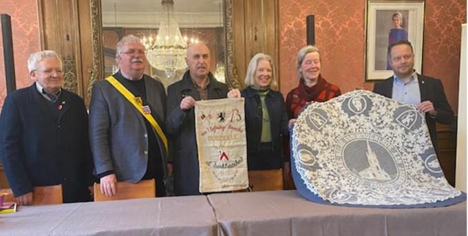 De Amerikanen Carol en Paul Brouha zakten speciaal af naar Brugge om de erfgoedstukken te overhandigen. Ze hadden ook een stuk War Lace, een kanten tafelkleed, indertijd gemaakt door kantwerksters van Hooglede, mee. Het historisch kantwerk zal voortaan bewaard en beheerd worden door de gemeente Hooglede.