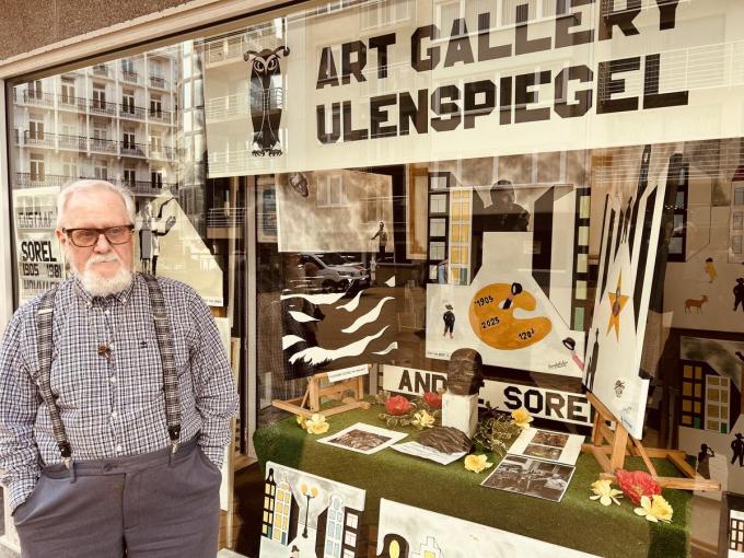 Vorig jaar was Ensor nog te gast in de etalage van zijn Art Gallery Ulenspiegel in de Vlaanderenstraat 72. Nu ziet de passant er onder andere het bronzen dodenmasker en de gevouwen handen van Gustaaf, gerealiseerd door Irénée Duriez, een aantal kopieën van zijn vaders werk en Andrés ontwerp van de postzegel als hommage aan zijn vader: de Vlaanderenramp omzoomd door Gustaafs portret en een schilderspalet. Voor de filatelisten: de postzegel heeft als waarde 1 eenheid en is enkel bij André Sorel te koop.