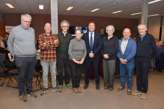 Op uitnodiging van Davidsfonds Langemark kwam Frankrijk-kenner en VRT-journalist Steven Decraene langs in Langemark. In zijn kenmerkende, energieke stijl boog Decraene zich over het thema ‘Frankrijk, een onmogelijk land’ en nam hij het publiek mee op een brede en belangwekkende tocht door de ziel van onze zuiderburen. De gewezen Stasegemnaar volgt Frankrijk al meer tien jaar vanop de eerste rij. Als verslaggever doorkruist hij het land voortdurend, klaar om het relaas uit te brengen van zowel ontroerende als turbulente momenten. Op de foto zien we Johan Mahieu, Philippe Vanderhaeghe, Peter Peene, Marie-Jeanne Vannoote, Steven Decraene, Vera Vermeulen, Rik Lepoudre en Pol Dewulf. (RB/foto RB)