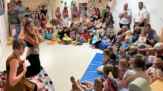In kinderdagverblijf Wiegelied in Oostende was er vrijdag bijzonder bezoek. Lien Agten en Lotta Bal (TAZ Youth) brachten in het kader van Theater Aan Zee een performance voor een 40-tal peuters, hun ouders en grootouders.