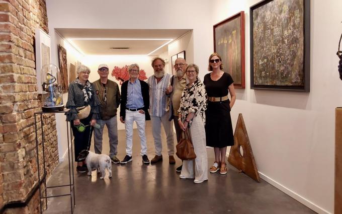 Het zomersalon in de Kaïrostraat 34 loopt tot 31 augustus, telkens op zaterdag en zondag van 14 tot 18 uur of op afspraak via 0478 973865. Op de foto v.l.n.r. Marleen Brasseur, curator Fred Maës, Jacques Verbeke, Jan De Graeve, Eric Leon, Mia De Ley en Rita De Waele. Ontbreken op de foto: Annie Vanhee, Geert Castelein en Sofia Speybrouck. (ML/foto ML)