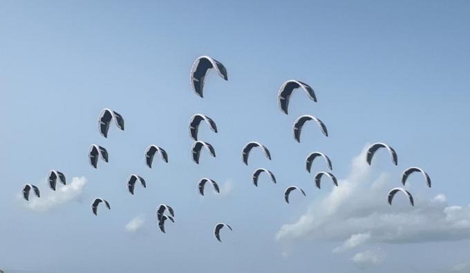 “Iedereen kreeg een startvolgorde, en moest dan één per één op de aangeduide plaats gaan staan en de kite min of meer onbeweeglijk in de lucht proberen te houden”, legt Frank Vanleenhove van Surfers Paradise uit. “Geen sinecure, als je weet dat de lijnen 25 meter lang zijn en de 30 kiters op 10 meter van elkaar moesten staan. Een spannende onderneming dus want als er één of meerdere kites in elkaar vliegen heb je meteen domino effect en mag er een streep getrokken worden door de ganse onderneming.”