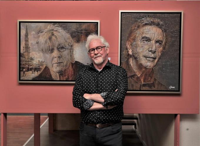 “De fermettestijl was in, er was veel vraag naar klassieke zeezichten en paarden, maar die heb ik altijd graag geschilderd, want ik zie graag dieren. De rode draad in mijn leven is dat ik continu bleef experimenteren, onder meer met recyclagemateriaal zoals battens van mijn stellingen uit de bouw, onderdelen van traplopers, wortelhout dat ik ooit kocht voor mijn tuin en bewerkte met plaaster en epoxy, bewerkte overschotten van arduin…” Onvermoeibaar zette Freddy zijn zoektocht naar nieuwe uitdagingen verder, maar mettertijd ging hij zich meer toeleggen op portretkunst. Als geen ander weet hij door kleureneffecten en contrasten sfeer en uitstraling te geven aan zijn portretten. Zo beschilderde hij grote bladen met achtergronden in aquarelverf waaruit hij een portret toverde, of hij experimenteerde met zwarte bordverf, Chinese inkt en houtskool. “Geld om modellen te betalen had ik niet”, lacht Freddy. “Daarom gebruikte ik altijd foto’s als uitgangsbasis voor een portret. Maar ik wil nooit een puur realistische weergave maken.” Freddy penseelde intussen talloze karakterkoppen van bv’s als Michael Jackson, Clouseau, Arno en… Will Tura. Daaruit blijkt zijn uitzonderlijke talent: in een unieke kleursetting kijkt elke kop je aan met een intrigerende blik die emoties opwekt. (MVQ)