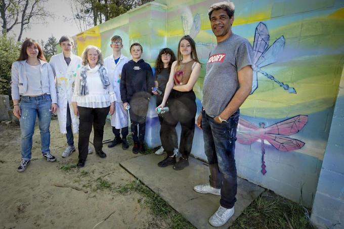 Voor het werk sloegen enkele leden van jeugdhuis Carpe Diem de handen in elkaar met kunstenaar X-Spray. “Graffiti krijgt meer en meer een plaats in de wereld van kunst”, klinkt het bij de artiest. “Ondertussen werd ik al gevraagd om muren te gaan decoreren in scholen en zelfs banken. Een kerkhof is dan weer iets totaal nieuws en we moesten er natuurlijk voor zorgen dat alles met eerbied werd uitgevoerd. Het werk vertelt het levensverhaal van begin tot einde, waar libellen de ziel van de overledenen begeleiden zodat ze nooit alleen zijn.”