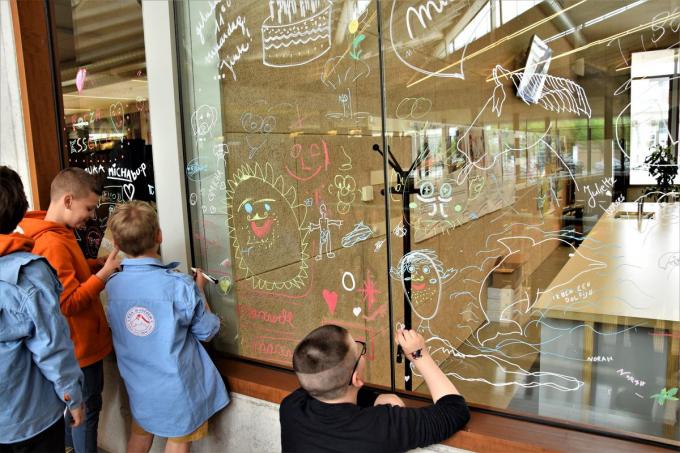 Waregem Tekent lokte zaterdagnamiddag heel wat creatievelingen naar het centrum. De ramen in de bib kleuren, de nieuwe woontorens schetsen of een pannenkoek met eetbare inkt maken, het programma bood voor elk wat wils.