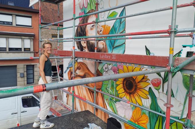 Pal tegenover haar ouderlijke woning is Julie Vercruysse (42) druk in de weer met een muurschilderij. “Het is allicht het grootste werk dat ik ooit voor mijn rekening mocht nemen. Ik werk tot 13 meter hoogte.”