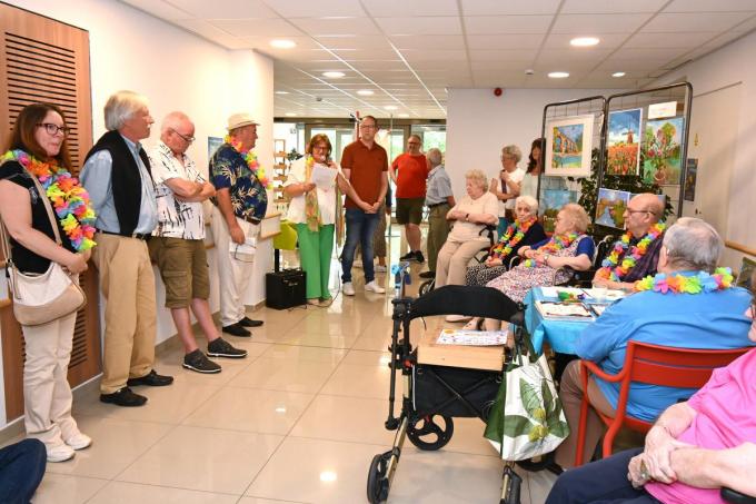 Enkele leden van de lokale kunstkring La Palette hadden samen met de bewoners Christian Dupon, Roland Vandeskelde, Josiane Demey, Ketty Decroix en Jeanine Garreyn de expo opgezet. Op de foto zien we zittend de vijf lokale artiesten in het gezelschap van CPAS-voorzitter Frédéric Hallez, enkele leden van La Palette en de genodigden tijdens de opening aan de ingang van het rusthuis.