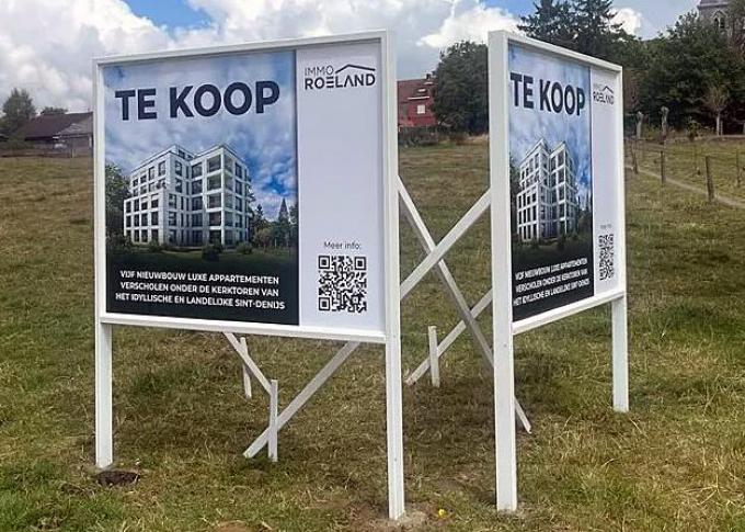 Een ervan zorgde al voor een beetje commotie in het landelijke dorp. De Antwerpse kunstenaar Roeland Tweelinckx maakte twee aankondigingsborden voor een luxueus bouwproject in Sint-Denijs. Op een weide zouden vijf luxeappartementen gebouwd worden. Wie interesse heeft kan de QR-code scannen om meer info te krijgen.
