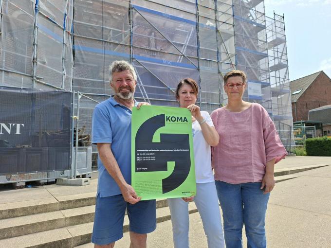 Sofie Demeyere, Els Samyn en Koen Grymonprez stellen KOMA voor ofte Kijk op Moorseelse Amateurkunstenaars. Het beeld van twee in elkaar gevlochten komma’s op groene achtergrond valt alvast op. “Na een ontmoeting op de vorige Buren bij Kunstenaars stelden we ons de vraag ‘kunnen we eens naar buiten komen met het werk van amateurkunstenaars uit Moorsele?’ en zo gezegd zo gedaan. Er kwam wel een en ander bij kijken.”