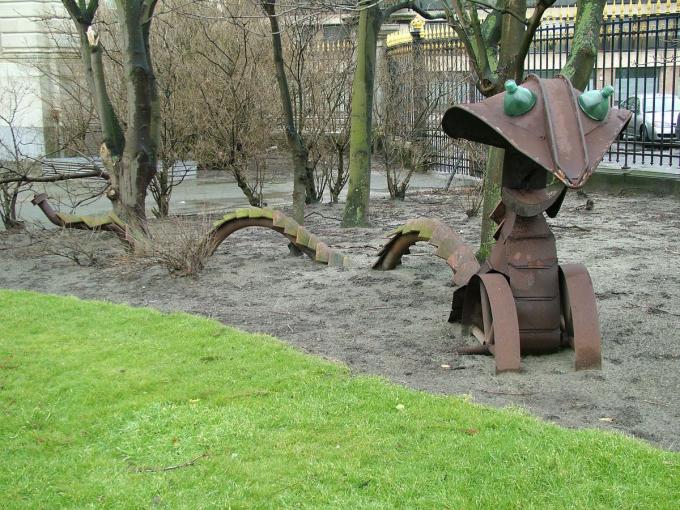 Het trekt zijn eigenzinnig spoor, gehuld in recyclage-onderdelen: de kop één vierde van een grote grijpkraan, ogen van hoogspanningsisolatoren, twee halve wagenwielen als voorpoten, een voorlijf van metalen afdekschubben, een op en onder de grond kronkelend lichaam van verkeerd geplooide buizen (nu met hoekdakpannen bedekt), en een staarteinde dat ooit een grondboor was.
