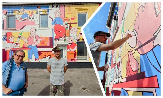 “Het is een mooie blikvanger, hè?”, zegt Pieter. “Het gebouw is van mijn ouders, en vroeger woonden hier André en Agnes. We wilden het iets extra’s geven. Ik ben al lang fan van Xavier zijn werk. Wat hij hier gemaakt heeft, is eigenlijk een familieportret – en ja, ik sta het grootst afgebeeld, dat hoort zo”, lacht hij.