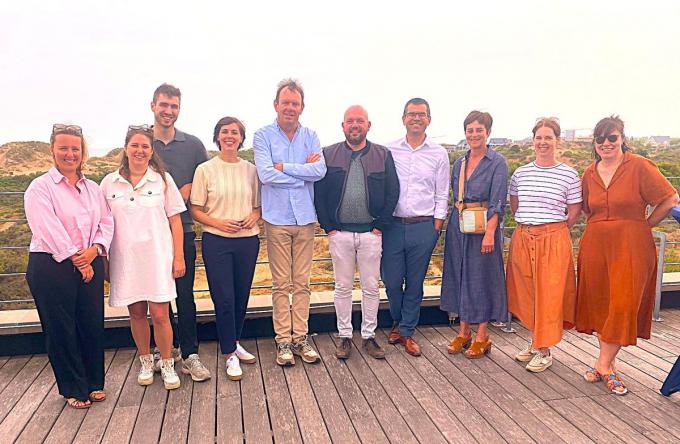We zien Kirke Hillewaere (schepen van Toerisme), Coralie Adriaensen (illustrator), Lucas Suykens (illustrator), Lien De Ruyck (schrijfster), Mike Louagie (fotograaf), Björn Cools (schepen van Jeugd en Groen), Sander Loones (burgemeester), Greet Verhaeghe (schepen van Cultuur), Charlotte Magherman en Katrien Hellinckx (beiden dienst milieu). © PG