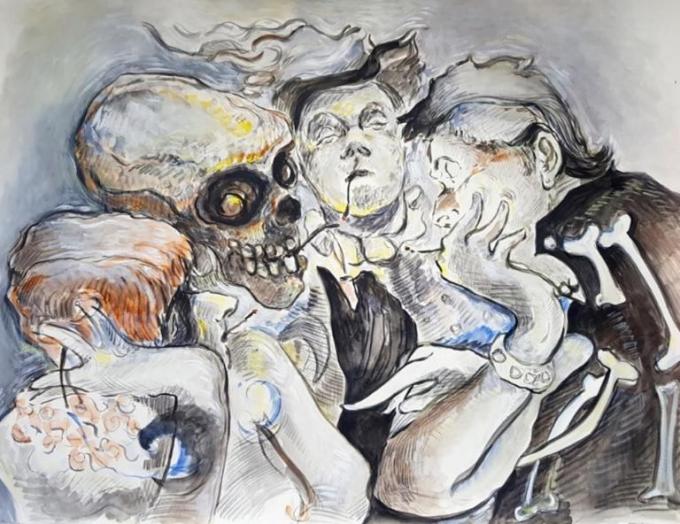 Tijdens dezelfde periode ontdek je ook de tentoonstelling ‘Careless Whispers’ van de Britse artieste Kate McCrickard. “De kunst van Kate McCrickard is bevolkt met punks, skaters, prostituees, skeletten, magiërs, rokers en flirtende ‘drageurs’. Ze sleurt je mee met composities van buitelende lijnen en uitgesproken kleuren op canvas of papier. Haar droge naalden krassen een gekke wilde wereld in de plaat met een krachtige zwarte grafiek als resultaat.”