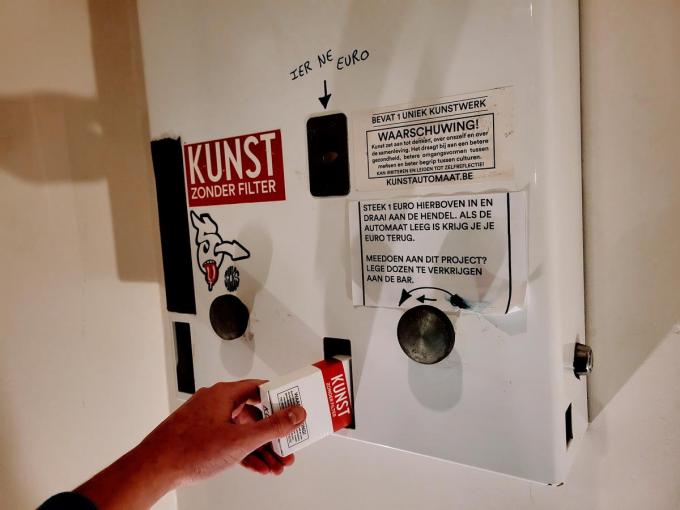 Uit een oude condoomautomaat op de eerste verdieping van de Gainsbar op de Vlasmarkt in Kortrijk haal je voor één euro een doosje kunst in huis. “Ik wil kunst toegankelijker maken en aan jonge artiesten een extra platform bieden”, zegt uitbater Alexander Cheyns (34). Wat je aankoopt, is steeds een verrassing.