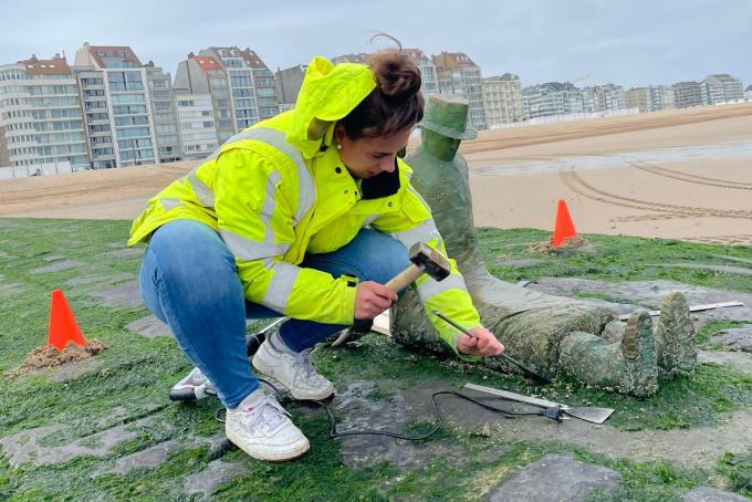 Het bronzen kunstwerk van Jean-Michel Folon op het strand is tijdelijk weggenomen door Art Salvage, die de beeldencollectie van Knokke-Heist onderhoudt en herstelt.