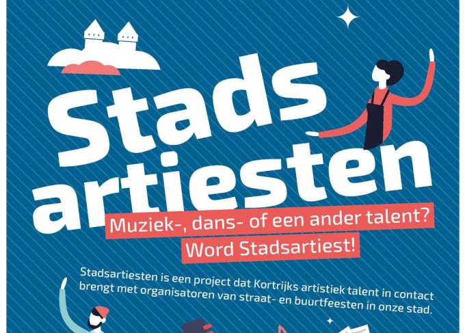 Kortrijk zoekt nieuwe lichting Stadsartiesten 2024-25. Het initiatief brengt lokaal talent in contact met de organisatoren van straat- en buurtfeesten. Die laatste krijgen de kosten (deels) terugbetaald wanneer ze een Stadsartiest boeken op hun feest.