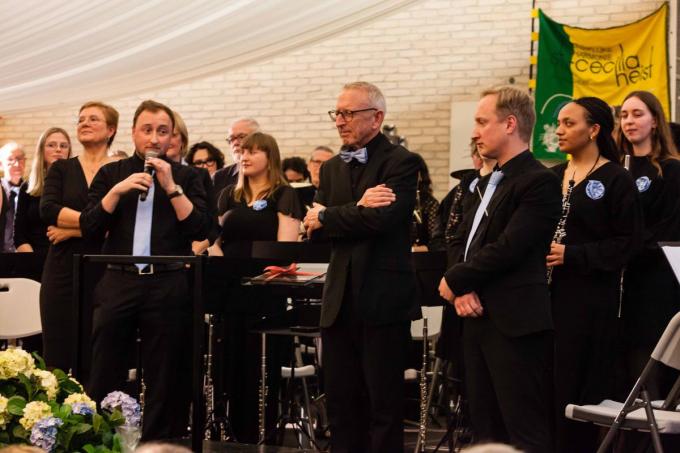 Op het einde van het concert droeg dirigent Rik Bonny zijn dirigeerstokje over aan zijn oudste zoon Bram. Voorzitter Danny Lannoy prees Rik voor de vele jaren van inzet voor de Harmonie. Uit handen van de lokale chocolatier Oliver Van Nueten kreeg hij een speciaal cadeau in de vorm van een ‘chocolade-instrument’.
