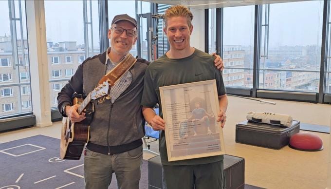Dat de Izegemse cabaretier Karel Declercq een fan is van Kevin De Bruyne én van Napels stak hij nooit onder stoelen of banken. Hij droomde er van om in Napels de ode aan zijn favoriete voetballer te brengen, maar nu Kevin De Bruyne in België aan zijn revalidatie werkt kon het wat dichter bij huis. “Hij was er echt mee gediend.” En toevallig was ook Eddy Merckx er aanwezig. “Ook hij genoot mee.”