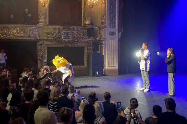 Brugge / Showbizz Brugge / Showbizz ‘Showbeest’ Jarno Boone (30) uit Ichtegem verrast met Koen Wauters en Francesco Planckaert tijdens verjaarsdagsshow in de Stadsschouwburg van Brugge 6 juni 2025