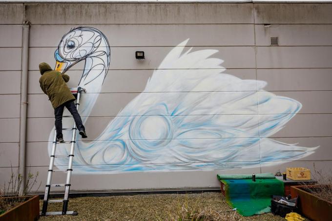 We spreken DZIA terwijl hij de contouren van een metershoge zwaan neerzet op een gevel aan de achterkant van De Gulden Zonne in hartje Hooglede. Eenmaal dat grote oppervlak klaar is, laat hij zijn kenmerkend lijnenspel los op de tekening. Dat doet hij volledig op gevoel, een feest om te zien. DZIA is een straffe naam op vlak van street art, op nationaal en internationaal vlak. Zijn identiteit en leeftijd houdt de man – die Limburgse roots heeft – liever geheim, maar zijn werk is bijzonder herkenbaar in binnen- en buitenland. Veelal gaat het om dieren: vossen, vogels, herten en hazen.