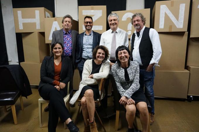 Zeven acteurs staan op scène en geven de monologen en dialogen vorm: Debbie Degrieck, Ann Orlans, Patrick Desmet, Geert Puype, Marjan Tratsaert, Duc Duquennoy en Rik Vanovenberghe.