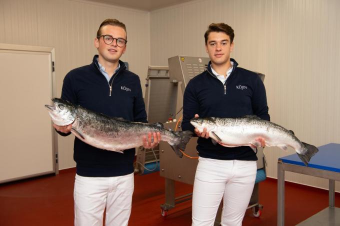 ‘Kojins’ Tuur en Stijn hebben de best mogelijke infrastructuur in hun zalmrokerij. “We willen uiteraard ook alleen topzalm roken, exclusieve gerookte zalm. Die verse zalm kopen we bij Mowi in Noorwegen, één van de grootste producenten van Atlantische zalm. Zalmen die gemiddeld 1,7 tot 2,1 kg wegen en een mooie vetstructuur hebben, wat een kenmerk is van een kwaliteitszalm. Amper 32 uur nadat ze in Noorwegen geslacht worden, zijn ze bij ons en kan het verwerkingsproces starten. De cyclus duurt één week. Eerst wordt de vis gepekeld, dan volgt één nacht rust en vervolgens wordt hij gekuist en klaargemaakt om het rookproces te starten. Na het roken koelen we de zalm af voor een rijpingsproces van 3 à 4 dagen. Tenslotte ontvellen we handmatig of machinaal de gerookte zalm en versnijden en verpakken we hem.”