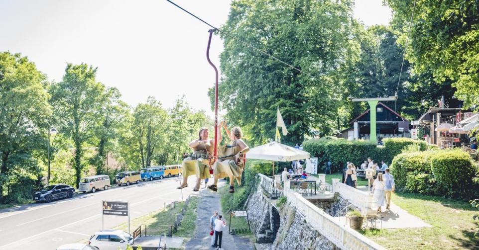 Zijn het de trappen, de overvloed aan groen, het interieur van de brasserie – met een echt werkende Leuvense stoof – of de kabellift zelf? Hoe dan ook, zodra je een voet zet op de site lijkt de tijd letterlijk en figuurlijk stil te staan. Je hebt er een prachtig zicht op het Heuvelland, nog voor je plaats neemt op een van de iconische zitjes. Je zweeft er van de Vidaigneberg naar de Baneberg – de zijheuvels van de bekende Rode- en Zwarteberg – en helemaal terug, boven de wijnranken van Entre-Deux-Monts en ook heel even boven de weg. Met mooi weer en wat geluk kan je in de verte de kustlijn en de IJzertoren spotten. Een goed kwartier lang ben je even weg van de wereld.