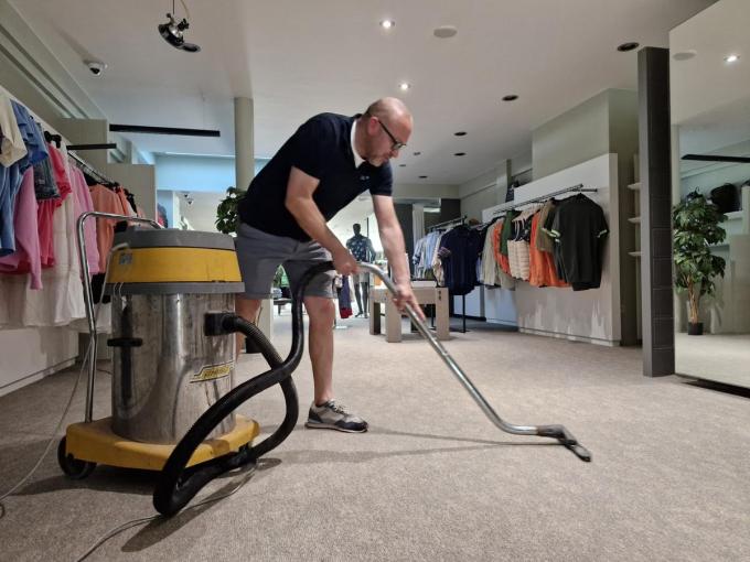 Sommige rekken met kleding – diegenen die onder de spots stonden – kregen vocht te slikken, al bleven de meeste rekken gespaard. Maar het kamerbrede tapijt in de winkel is van voor tot achter compleet doorweekt. De familie kon zaterdag niet anders dan een blaadje in de etalage hangen waarop te lezen staat dat de winkel voorlopig dicht bleef. “We hebben de hoofdkraan meteen dichtgedraaid en deze voormiddag is de verzekering al langsgekomen”, vertelt Bert Verstraete. Hij was zaterdag de hele dag in de weer met een waterstofzuiger, terwijl hij ook alle kledij zorgvuldig controleerde. “We gaan straks ook een warmtekanon zetten in de hoop het tapijt zo snel mogelijk droog te krijgen.”