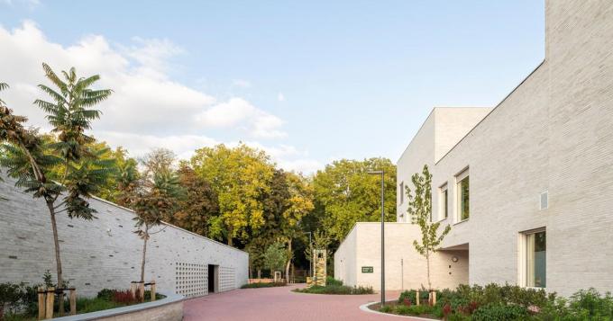 “Het ontwerpteam van VK kwam met een concept van verbonden woningen met binnentuin: drie rijwoningen aan de Langemeersstraat, met tussenliggende tuinen en een stadsmuur, en twee dieper gelegen huizen in het park, elk met een omsloten tuin. Een centrale straat verbindt de vijf woningen en vormt zo een zorgstraat voor de zorgverlener en een speelstraat voor de jeugd. Het opzet was kleinschalige zorg bieden aan kwetsbare jongeren in een grotere zorgcontext, ingebed in een nog grotere stedelijke omgeving. De speelstraat verbindt alle afdelingen fysiek met elkaar. Zo kunnen de zorgverleners snel ingrijpen in crisissituaties”, aldus Bert Scheirlynck, senior architect bij VK architects+engineers. “De gebouwen met verschillende hoogtes en de muren rondom de binnentuinen maken het geheel levendig. De tuinen fleuren de doorgang op en benadrukken het groene karakter van het project binnen het stadsbeeld. Het is een structuur op maat van de gebruiker, maar met een knipoog naar de omgeving.”