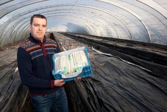 Net zoals vorig jaar kwam Kris Bossuyt met de eerste kistjes asperges aan op de REO Veiling. De producent uit Oostrozebeke had negen kisten mee, met acht schaaltjes van elk een halve kilogram. De primeurasperges werden aangevoerd in drie Flandria kwaliteitsklassen. “Traditioneel draait de consumptie van witte asperges rond Pasen op volle toeren. Maar niet iedereen weet dat de delicatesse al vanaf eind februari ter beschikking is”, merkt hij op. “De witte asperges die momenteel verkrijgbaar zijn, worden geteeld onder serreglas of in plastieken tunnels en met verwarmingsbuizen in de grond. Wie vandaag de grondverwarming in gang zet, weet dat de asperges over een viertal weken de kop opsteken.”