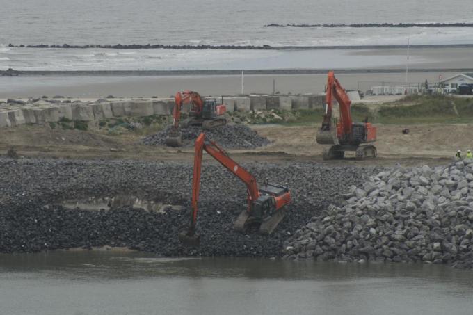 Het noordelijk deel van de verbreding bestaat uit een talud, dat nog in aanleg is. Richting sluis wordt een betonnen kaaimuur of combiwand aangelegd. Een deel van het talud verzakte over een lengte van zo’n 20 meter en tot een paar meter boven de hoogwaterlijn. Op dit moment was er al een folie op de helling aangelegd. Ook was er een eerste deklaag kleinere natuursteen gestort. Zaterdagochtend werd de ontstane inklinking met een graafkraan weer opgevuld met natuursteen. Later komt er over het hele talud nog een laag met grotere natuursteen. De glooiing wordt dan gedeeltelijk afgedekt met HARO-blokken.
