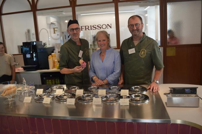 In de Smedenstraat 8 in Brugge openden Joeri Sterckx (52) en Filiep Terryn (60) de deuren van ijssalon Frisson. “Het aantal ijssoorten houden we bewust beperkt om constante kwaliteit te garanderen”, zegt Joeri. “En we hebben ook specialiteiten zoals de ‘Brugse Bol’; een warm brioche broodje met een bol Frisson-ijs ertussen.”