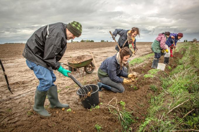 Gleenie kan rekenen op enthousiasme bij de landbouwers. “We zijn geen grote boeren en met onze machine kunnen we door de nattigheid nu niet aan het einde van het veld. Het zou jammer zijn om dit te laten verloren gaan, dus dan delen we het veel liever”, zegt Moniek Desmet, eigenaar van het aardappelveld in Reningelst. “Met je handen in de aarde wroeten doet sowieso deugd, maar zo beseffen mensen ook weer waar hun voedsel vandaan komt. Dit zorgt ook voor een samenhorigheidsgevoel. Het is fantastisch om te zien hoe mensen die elkaar niet kennen toch aan de praat geraken en achteraf samen genieten van een taartje en een koffie.” De vrije bijdrage ging volledig naar het project ‘De Weij’ van landbouwers Moniek en Jos. (Lees verder onder de foto)