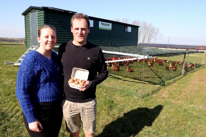 ‘t Kippengeluk, zo heet de kippenmobiel van Michael Doucin (23) en Lisa Depoorter (23). Op de Zandberg in De Klijte verblijven sinds een tijdje 250 legkippen in een mobiele kippenkar. “In Nederland zie je dergelijke kippenmobielen meer, maar in West-Vlaanderen is het nog vrij uitzonderlijk.”