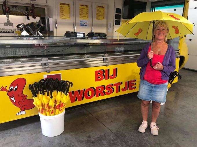 Zo kunnen ze bij alle standen beschermd wachten voor de regen. Er zijn twee grote emmers te vinden aan hun marktwagen met gebruikte en niet-gebruikte regenschermen. De gebruikte regenschermen worden telkens opnieuw ontsmet in de strijd tegen het coronavirus.