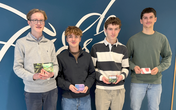 Simon Vandoorne, Kobe Jolyt, Thomas Van Goethem en Jasper Naessens zijn de vier bedenkers van het originele concept van hun mini-onderneming Rehold. “We wilden initieel gewone portefeuilles verkopen, maar onze leraar en coach Tim Decuypere maande ons aan om een origineel product te bedenken”, aldus Thomas Van Goethem (17). “Zijn opmerking dat je in heel wat winkels in Brugge een portefeuille voor een prikje kan kopen, was terecht. We zochten een origineel alternatief en uiteindelijk verkopen we nu portefeuilles, kaarthouders en muntzakjes in vrachtwagen- en reclamezeil. We hadden uitgezocht waar we die afgedankte zeilen gratis konden ophalen en na wat zoekwerk vonden we ook een bedrijf in Brakel, dat kledij en textiel restylet tot iets nieuws (’t Uniek, red.), dat met ons in zee wou gaan.”
