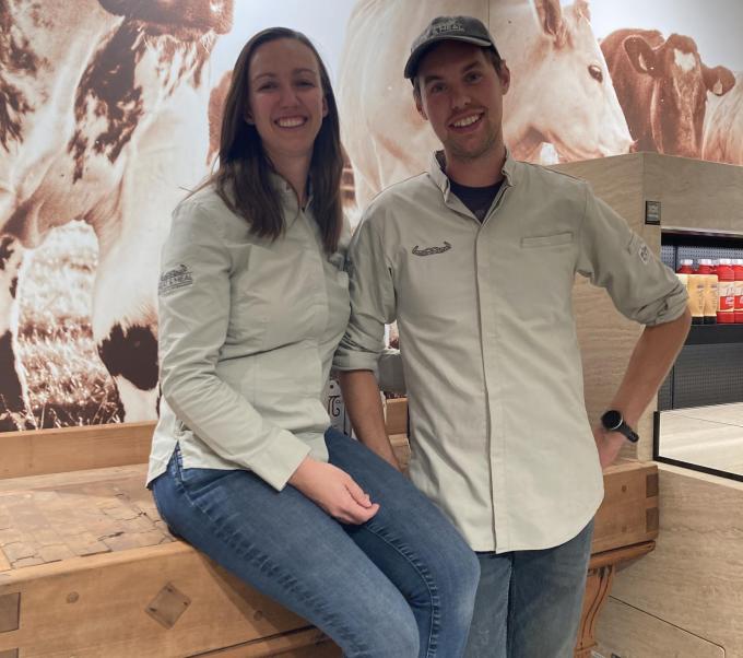 “Ik zie graag wie onze producten komt kopen en ik vind het altijd fijn als ik een goed stukje vlees kan snijden en persoonlijk aan de klant kan geven. Troef van onze slagerij is dat onze runderen afkomstig zijn van de ouderlijke hoeve van Alexander. De grote rijpingskast met verschillende gerijpte rassen bevindt zich naast de open keuken en de klanten kunnen dus echt een stukje vlees naar keuze uit de rijpingskast bestellen”, gaan ze verder.